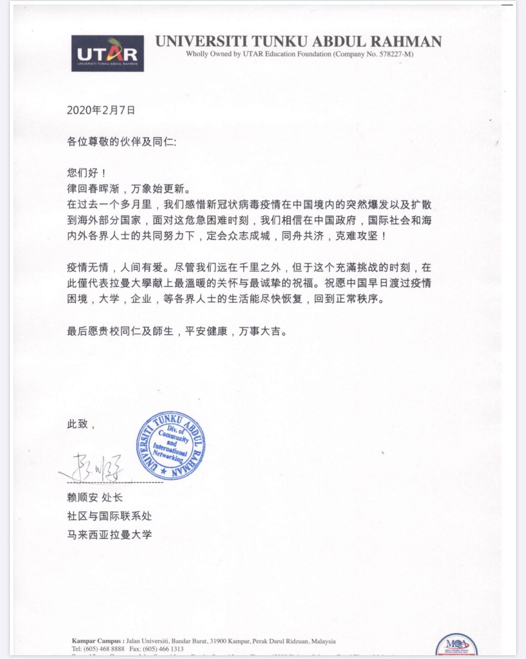 疾风知劲草,患难见真情!在当前抗击新冠肺炎疫情的全民战役中,公司收到来自马来西亚拉曼大学,加拿大西安大略大学,以色列耶路撒冷希伯来大学的真情慰问。他们表示会力所能及的为在校中国职工和研究员提供帮助,并向那些义无反顾奋战在疫情前线的中国医护人员表示致敬。他们愿意与中国携手抗击疫情,坚信中国人民定会万众一心,凝心聚力,取得疫情防控阻击战的终极胜利!