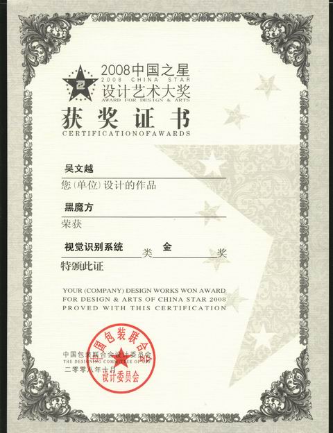 由中国包装联合会设计委员会主办的最具盛誉的国家大奖——“2008中国之星设计艺术大奖”评比活动于今秋落下帷幕,公司设计系青年教师吴文越在视觉识别系统项目上获得金奖,为公司争得了荣誉和光彩。