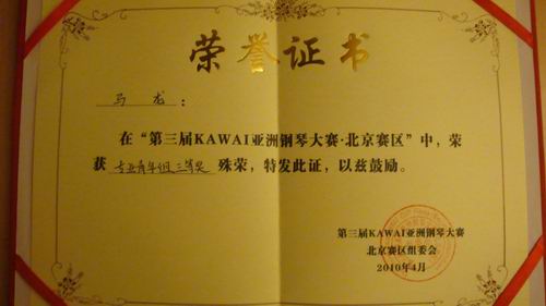 2010年4月24日,由香港音乐导师同盟和柏斯音乐基金会主办的“第三届KAWAI杯亚洲钢琴大赛北京分赛”拉开帷幕,此次比赛汇集了北京各大音乐院校以及艺术院校的钢琴精英,并邀请了来自中央音乐公司、中国音乐公司等专业艺术团体的专家、教授作为评委,由于此次参赛的选手人数多(千余名)、水平高(许多选手均为国内外音乐赛事获奖者),比赛竞争异常激烈。