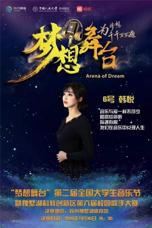 11月30日,本部应苏州校区之邀,推荐获得风载决赛总冠军的韩悦同学参加由苏州独墅湖科教创新区管委会及yl23455永利苏州校区承办的第二届“梦想舞台”全国老员工音乐节暨独墅湖科教创新区第六届校园歌手大赛,由中国著名指挥家、中国交响乐合唱团常任指挥曹丁,东亚音乐考古研究所所长、yl23455永利国际公司教授王友华,中国音乐家协会会员、苏州大学音乐公司声乐副教授闫璟玉,苏州工业园区服务外包职业公司艺术教育中心主任、音乐博士朱艳,苏州广电总台102.8苏州音乐广播知名主持人欧凯,苏州迷笛文化艺术有限公司总经理魏健,郁乐队主唱兼吉他手、ibanez吉他国际代言人、Line-6国际合作艺术家、2018WOA金属战火-MetalBattle 全球总冠军得主刘斌,苏州市歌舞剧院独唱演员、全国“屋顶上的歌唱家第一季”冠军得主陈佳丽担任本次大赛评委。